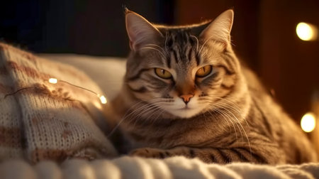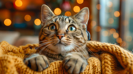 A wide-eyed tabby cat wrapped in a cozy knitted blanket with a bokeh light background.