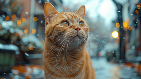 A close-up shot features a ginger cat with striking yellow eyes, set against a blurred neutral background. The cat's fur displays a pattern of orange and white hues. The composition and lighting create a sense of direct engagement, suitable for various editorial and commercial applications.