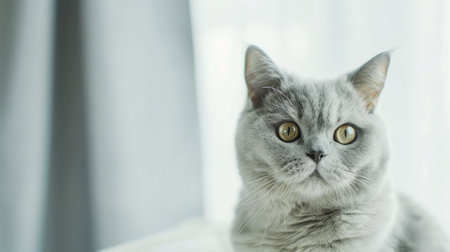 A domestic cat with grey and white fur is featured in a medium shot indoors. The animal is the primary subject, with striking green eyes. The image has a clean aesthetic with diffused natural light and a soft focus. Suitable for diverse editorial and commercial applications.