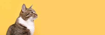 Banner with portrait of gray tabby cat looking away in front of yellow background.