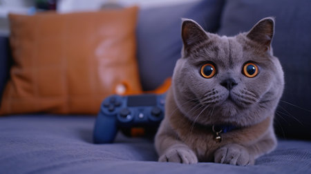Close-up of cat playing video game. funny cat with joystick controller enjoying hobby.