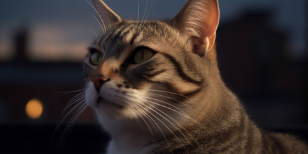 An AI generated illustration of a cute tabby cat looking aside with the city in the background