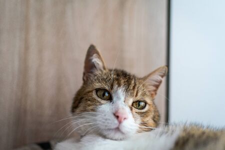 Photo of domestic cat (pet) in closed plan, with a fixed and cute look. Real animal in a real situation.