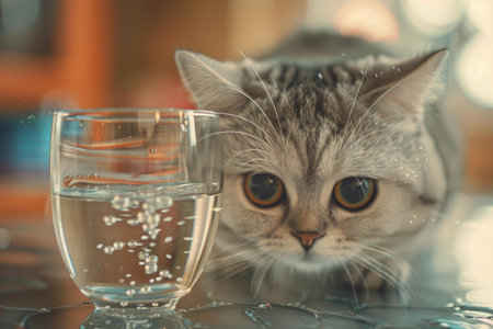 A tabby cat with wide eyes curiously gazes at a glass of water on a wet surface