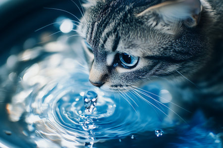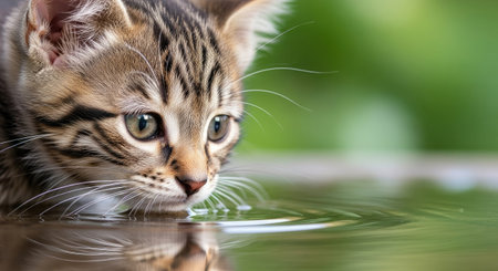 A close-up shot captures a tabby cat drinking water. The cat's fur displays a pattern of brown and black stripes. The shallow water surface reflects the cat and its surroundings. The scene benefits from natural lighting and a soft, green bokeh background. Suitable for various editorial and commercial applications.