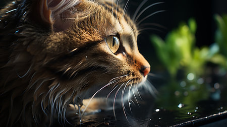 A captivating close-up of a charming cat face with water droplets. The soft bokeh effect in the background adds a dreamy quality to this delightful moment.