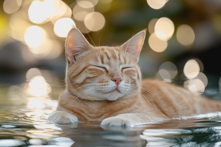 Orange tabby cat floating peacefully in rippling water with soft sunlight and bokeh lights.