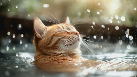 A playful cat splashes joyfully in water, capturing the essence of fun and curiosity. The light reflects on droplets, enhancing the whimsical scene.