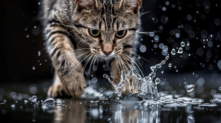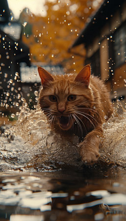 Playful cat running through a puddle, joyfully creating splashes of water in its path