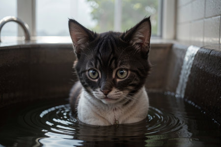 A charming cat plays in water, creating bubbles and splashes. This delightful scene captures the joy of a playful pet enjoying bath time, radiating innocence.