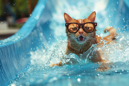 A happy cat in glasses riding on the water slide in the waterpark