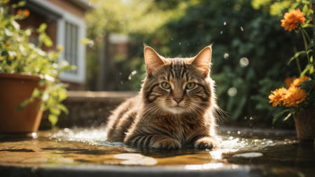 A playful cat enjoys splashing in water, showcasing its curious expression and delightful personality. This whimsical scene captures the joy of pets in playful moments.