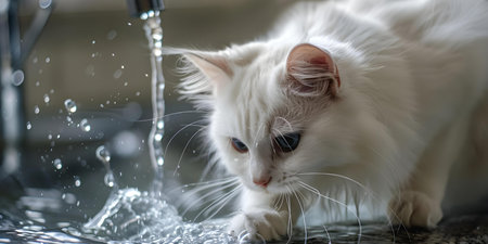 A white cat drinking water from a faucet. Concept Pet photography, Animals, Hydration, Domestic cats, Household activities