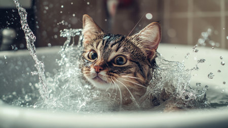 A whimsical cat joyfully splashes in water, capturing a moment of curiosity and playfulness. This image showcases the fun and unexpected behaviors of pets in a home setting.