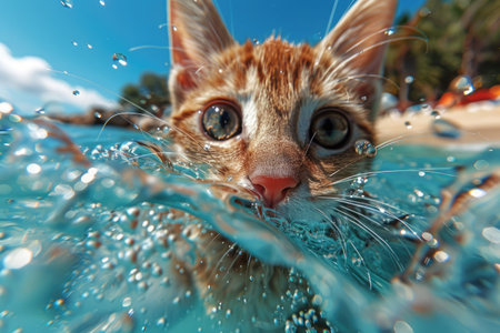 A cheerful cat splashes through water, showcasing its playful spirit and adorable features. The vibrant scene captures the joy and energy of this furry companion.