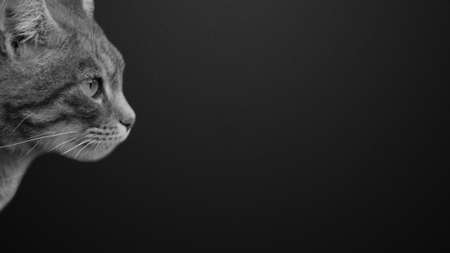 Dark low key portrait of a pretty tabby cat with long white whiskers staring into the camera in a close up head shot. Banner isolated on black background