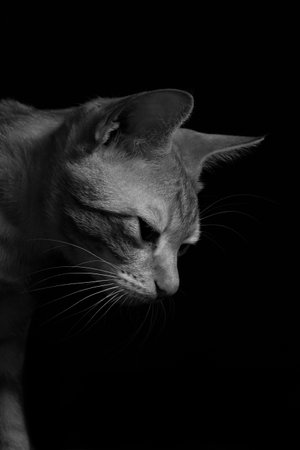 Cat in the dark. Portrait of a Kitty who is looking up on a black background.Suitable for posters,flyers,banner