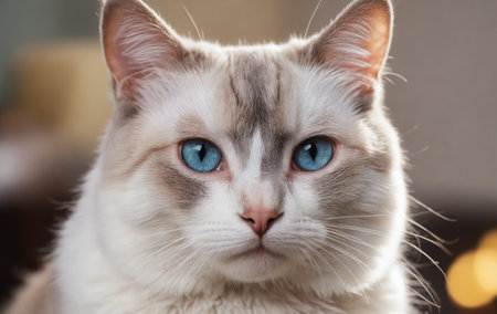Close-up of beautiful cat with striking blue eyes, fur mix of cream and brown. Animal looking directly at camera with curious expression
