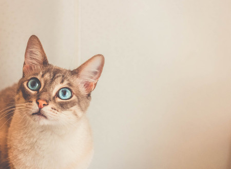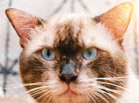 Portrait of Siamese cat looking at camera brown fur and blue eye animal pet.