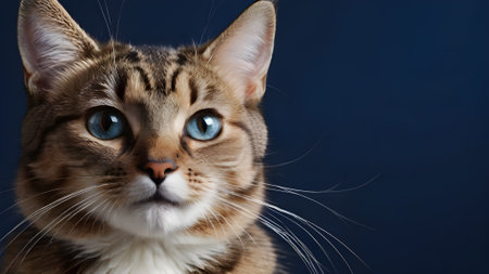 Closeup portrait of a beautiful tabby cat with striking blue eyes