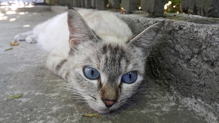 Blue-eyed cat lays in the shade hiding from the hot sun