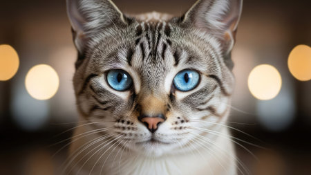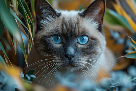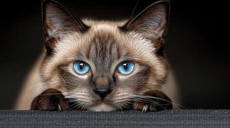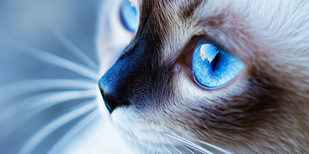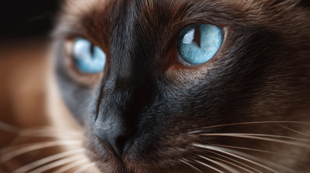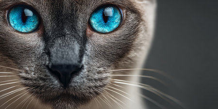 Detailed close-up photo of stunning siamese cat with striking, piercing blue eyes