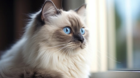 Siamese Persian cat with azure eyes and thick light brown-white fur, mustache, lies at the window.