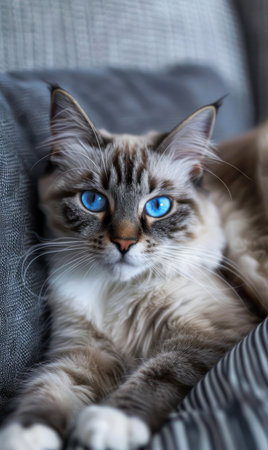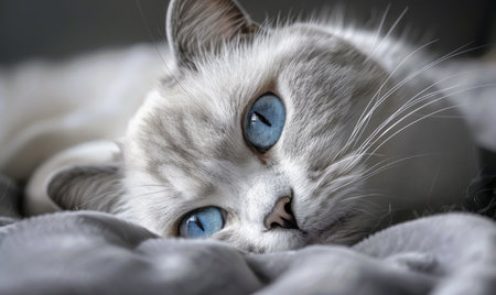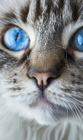 Stunning Portrait of a Ragdoll Cat with Striking Blue Eyes and Soft White and Gray Fur Markings