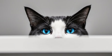 AI Generated. A black and white cat with bright blue eyes stares intensely at the camera