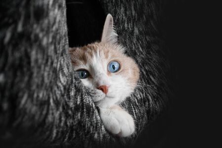 Blue-eyed cat peeking through wooden structure capturing curiosity, playfulness and companionship in home or pet-related concepts.