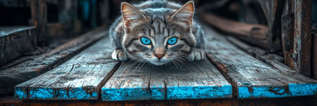 Intense Gaze Of A Striped Gray Cat With Bright Blue Eyes, Sitting On Old, Weathered Planks