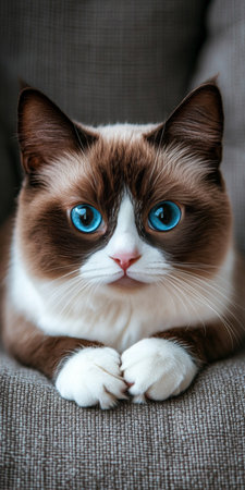 Graceful Ragdoll Cat with Blue Eyes Posing Against Soft Gray Background in Stunning Portrait Image