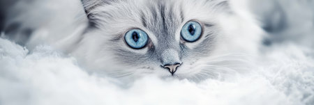 A close-up shot showcases a fluffy white cat with captivating blue eyes, bathed in soft, natural light. The fur has a soft texture, and the composition focuses on the animal's head and face. The image could be suitable for various editorial or commercial projects seeking animal imagery.