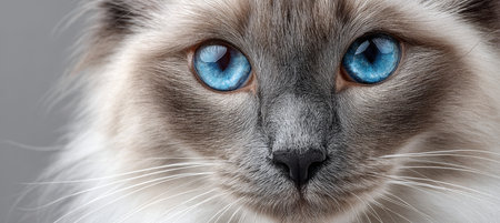 Elegant Himalayan Cat Portrait with Striking Blue Eyes Against a Soft Gray Background, Feline Beauty