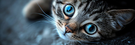 An intimate close-up of a tabby cat with striking blue eyes and soft fur. Generate AI
