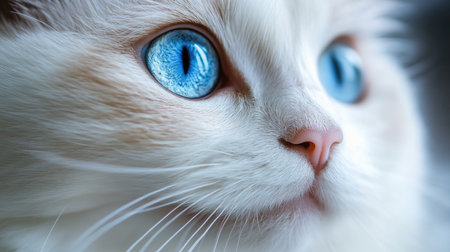 Close-up of a white cat with piercing blue eyes, showcasing its soft fur and delicate features