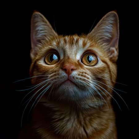 A curious tabby cat gazes upwards in the dim, atmospheric light.