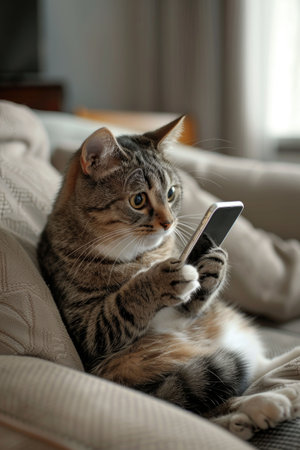 A fluffy pet cat looks into a smartphone and is surprised by the discounts. The concept of autumn discounts, black Friday sales.