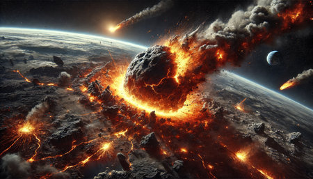 A fiery asteroid impact on a planets surface, with debris raining down from the sky.