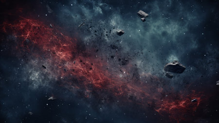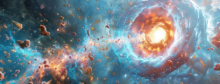 Abstract cosmic scene with glowing asteroids and colorful explosion in deep outer space.