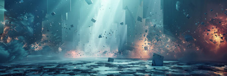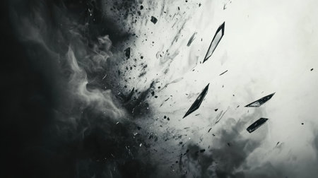 This image portrays an abstract explosion featuring glass shards and smoke against a dark backdrop, creating a dynamic and striking visual impact.