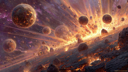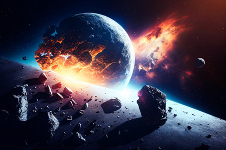 This image showcases a dynamic celestial event involving planetary fragmentation. Vivid oranges and blues dominate the composition, representing intense energy. The artwork portrays a cosmic scene with scattered debris amidst a starry background, suggesting vastness and power. Suitable for conceptual illustrations or science-related projects.