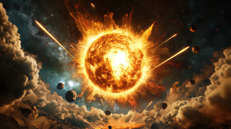 A dramatic depiction of an explosive solar eruption with a meteor shower, showcasing vibrant colors and cosmic elements in deep space. Ideal for sci-fi themes.