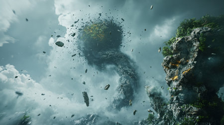 A breathtaking portrayal of a floating island amidst dramatic clouds and erupting rocks, emphasizing the raw power and beauty of nature in a surreal and captivating landscape.