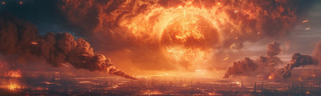 A spectacular nuclear explosion erupts in the night sky above a city, its fiery plumes creating a stark contrast against the urban skyline