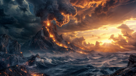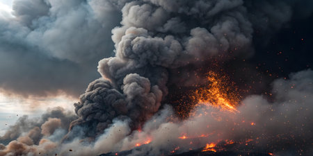 Explosive volcanic eruption with glowing lava and dark ash cloud, showing nature's destructive beauty and geological power.