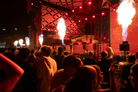 Stage lights and crowd of audience with hands raised at a music festival. Fans enjoying the party vibes.