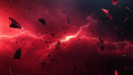 This striking image features a dramatic lightning bolt bursting through dark cosmic space, radiating fiery red hues against a black background.