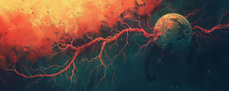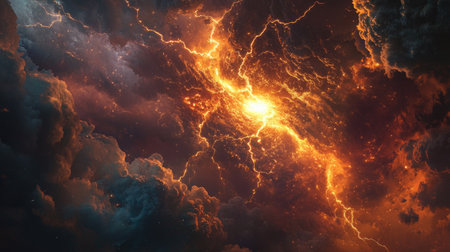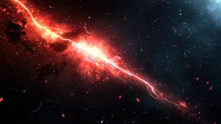 This stunning image depicts a vibrant cosmic explosion with bolts of lightning set against a dark nebula. A dramatic representation of the universe's beauty and mystery.