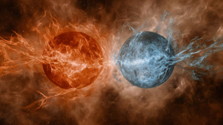 AI Generated. Explosive clash of blue and orange lights in darkness represents the dynamic conflict between light and darkness